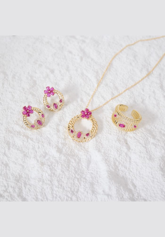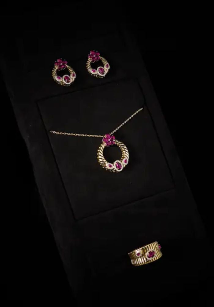 طقم يتلألأ بلمعه ألماسيه في طبقات تنبض بسحر خالد وفخامه ملكيه يتجسد بين حجر باللون الوردي شغل يدوي بجودة عاليه وتصميم راقي 💎