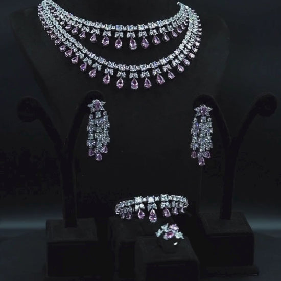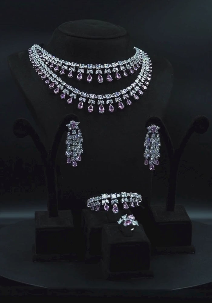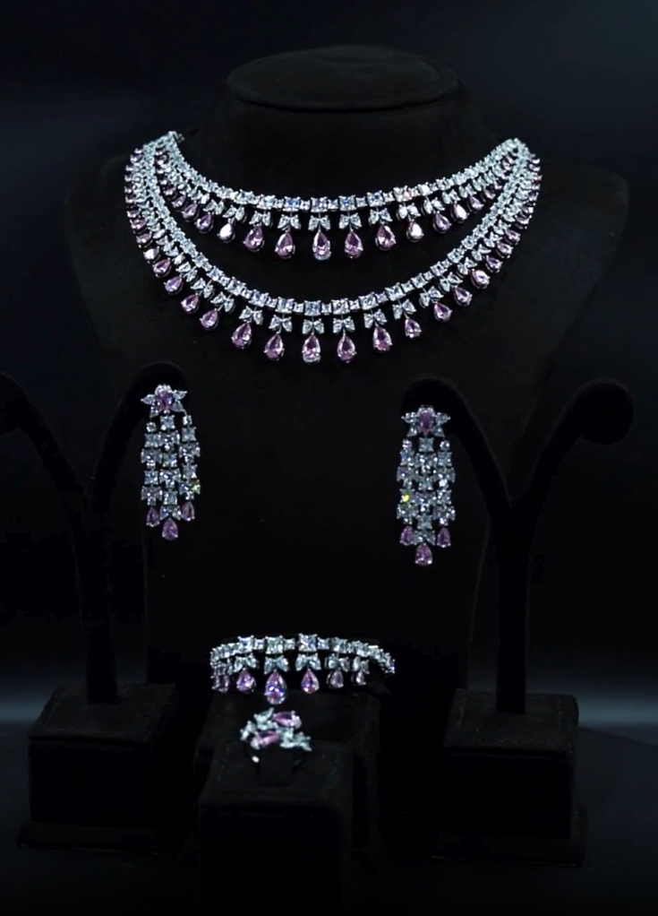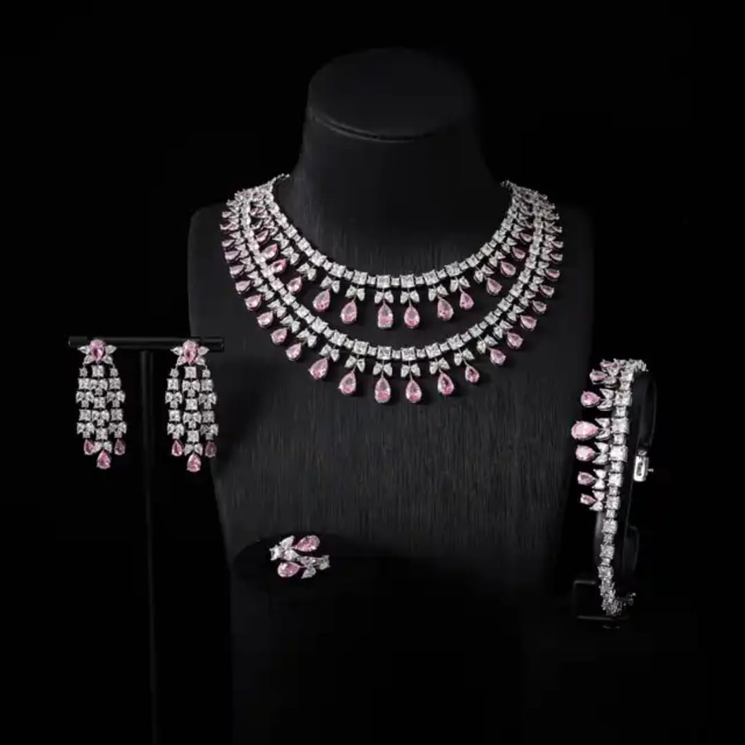 طقم يتلألأ بلمعه ألماسيه في طبقات تنبض بسحر خالد وفخامه ملكيه يتجسد بين حجر باللون الوردي شغل يدوي بجودة عاليه وتصميم راقي 💎