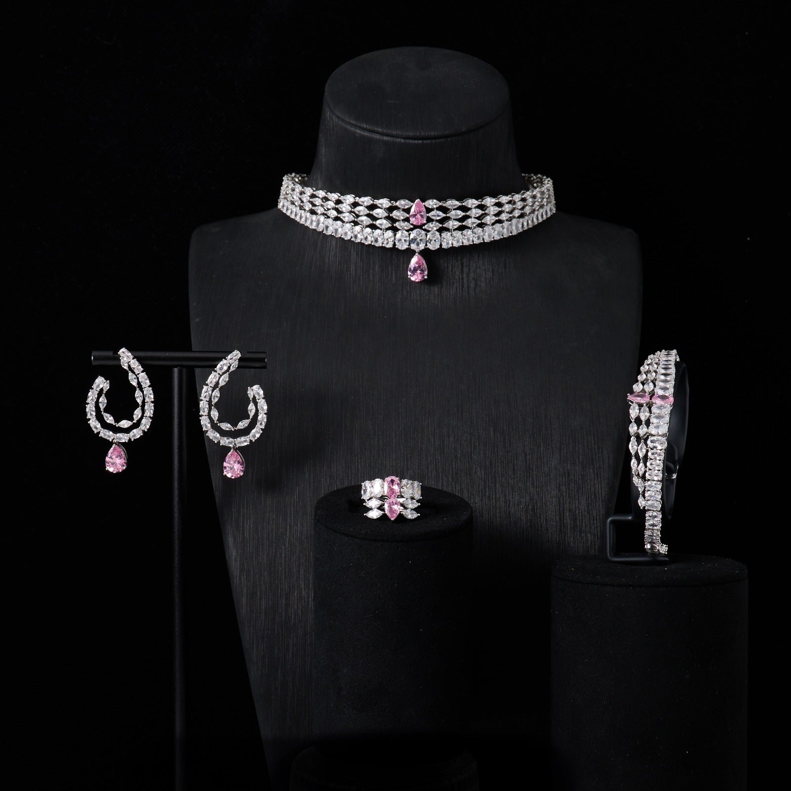 طقم يتلألأ بلمعه ألماسيه في طبقات تنبض بسحر خالد وفخامه ملكيه يتجسد بين حجر باللون الوردي شغل يدوي بجودة عاليه وتصميم راقي 💎