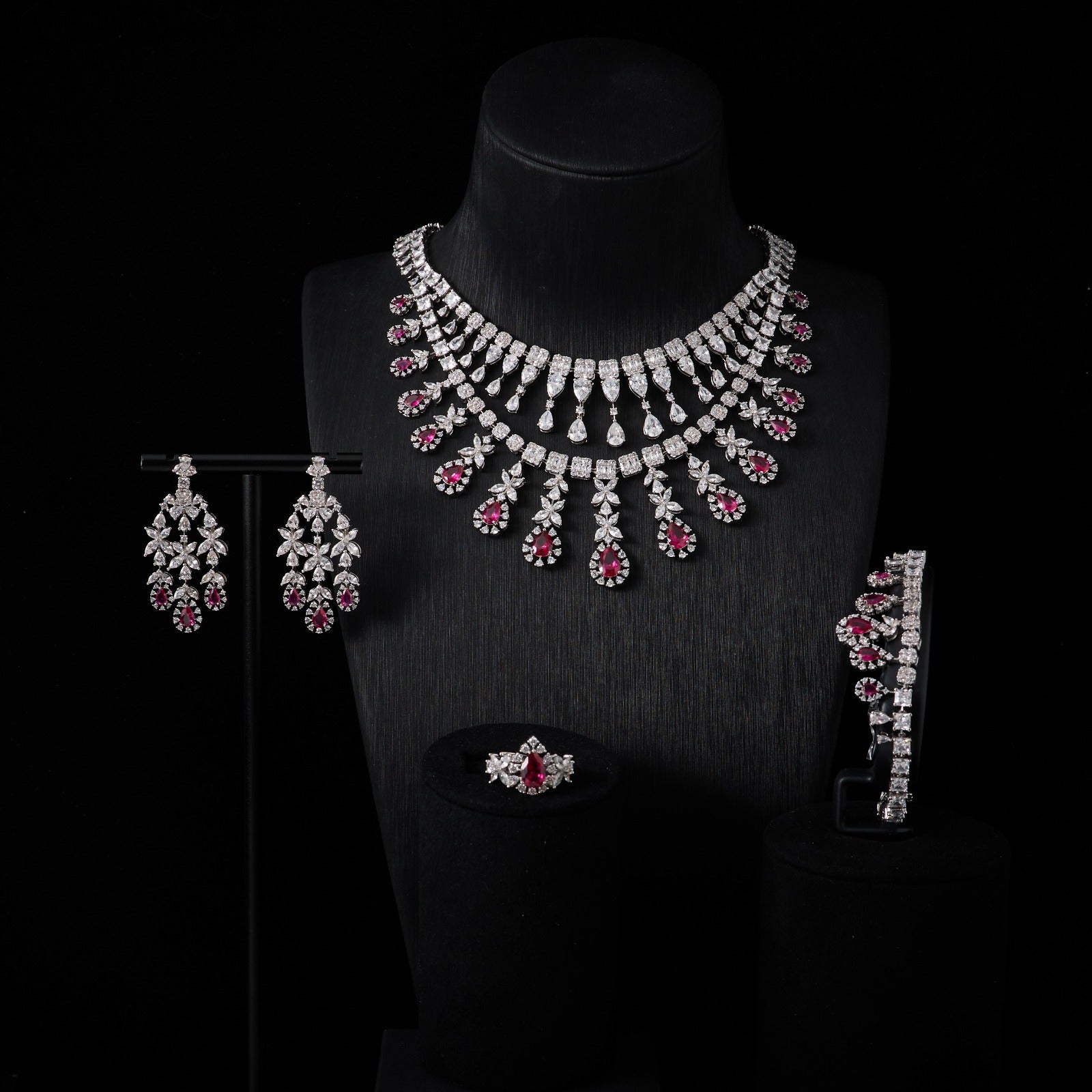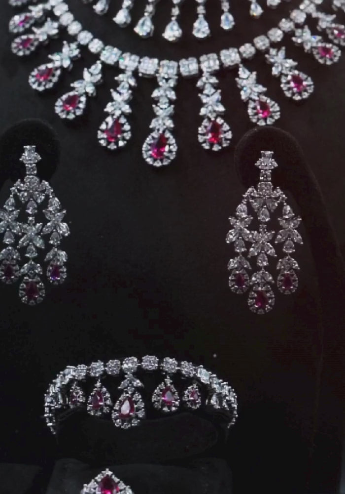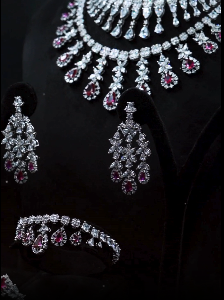 طقم يتلألأ بلمعه ألماسيه في طبقات تنبض بسحر خالد وفخامه ملكيه يتجسد بين حجر باللون الوردي شغل يدوي بجودة عاليه وتصميم راقي 💎